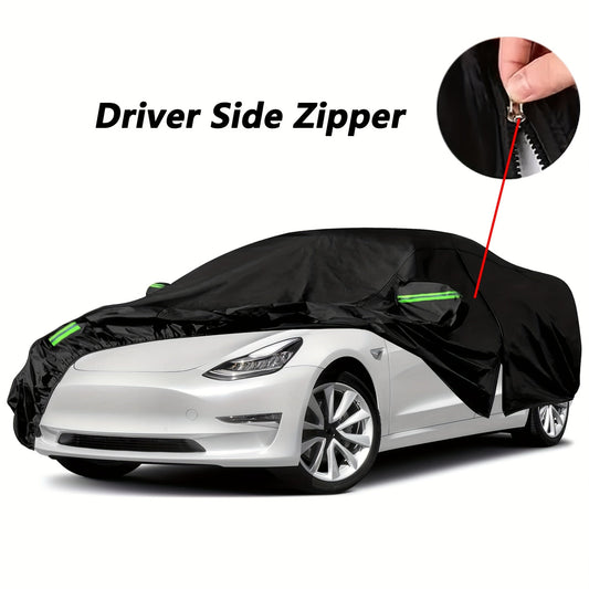 Tesla Model 3 with Zipper Door, Black UV Protection Windproof Cover, Six Reflective Strips for Nighttime Vehicle Safety
