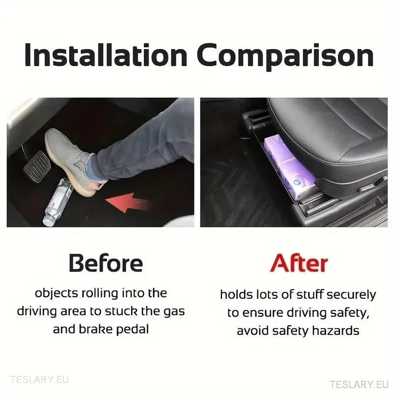 Jeg har installert to av disse i min 2024 Model Y med dobbeltmotor, og under førersetet har jeg rengjøringsmidler, inkludert en trådløs støvsuger, og på passasjersiden oppbevarer jeg dokumenter.