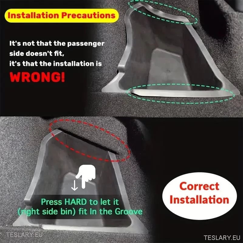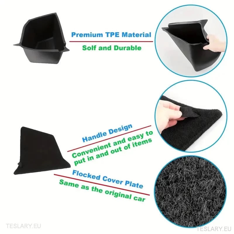Bagasjeromsorganisator til Tesla Model 3 med velourlokk som ligner veldig på den originale finishen på bagasjeromsteppet, slik at det ser originalt ut for bilen når det er montert. Det gir ekstra organisert oppbevaringsplass som er skjult når lokket er på plass. Spesialdesignet for Tesla Model 3 2019–2024 (ikke Highland).