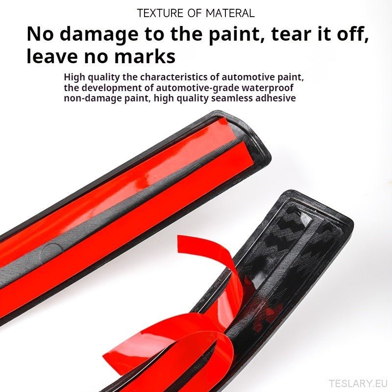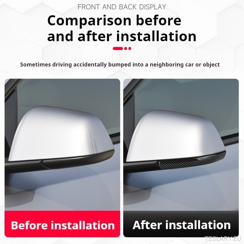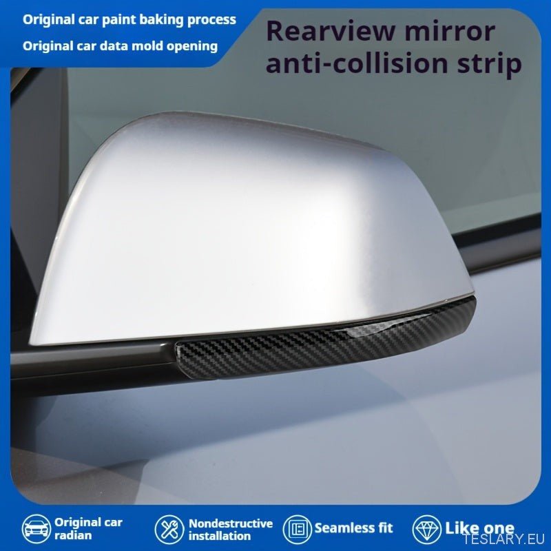 Tesla Model y Antikollisjonsstrimler for sidespeil tilgjengelig i hvitt, svart og karbonfibermønster