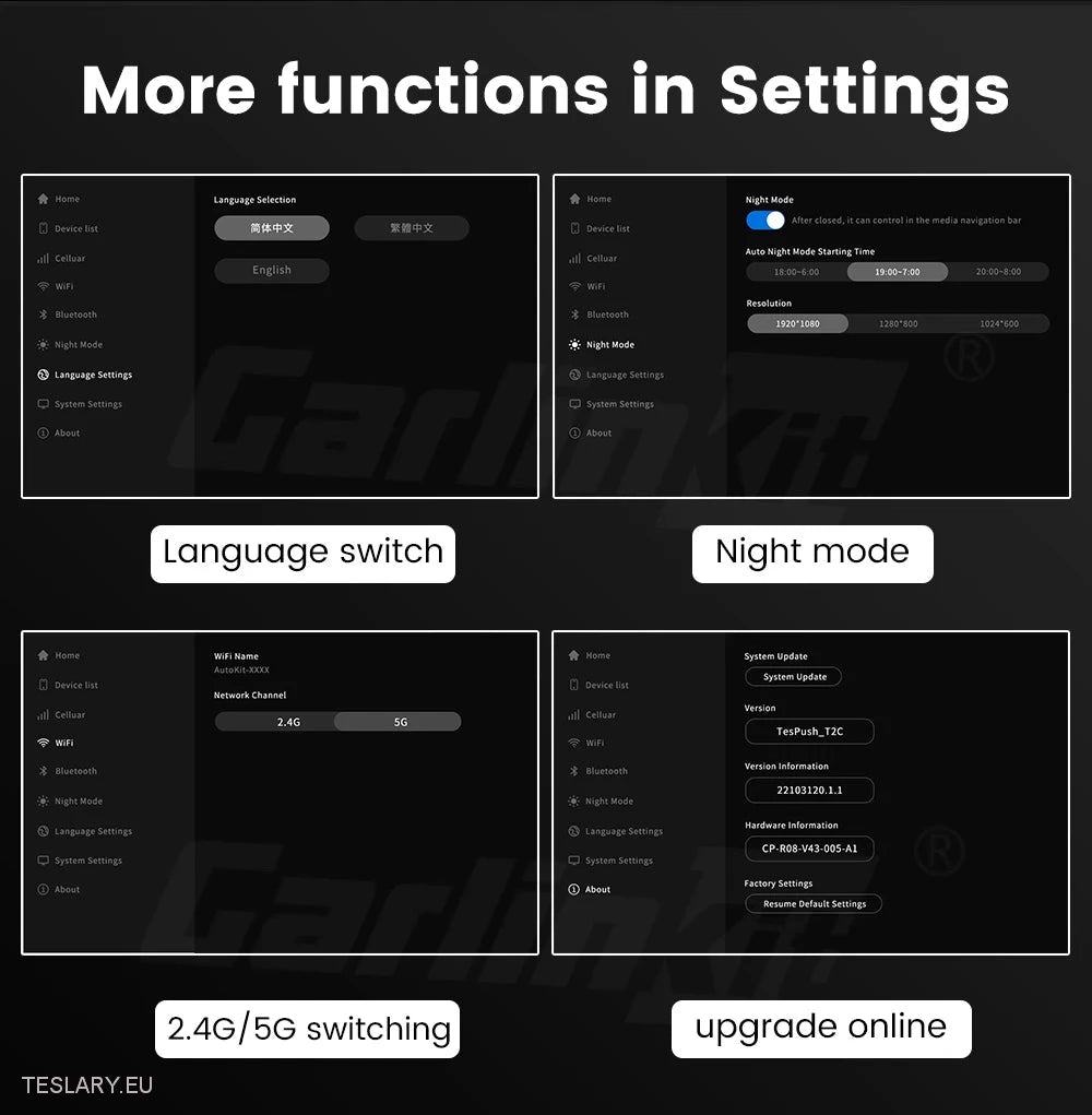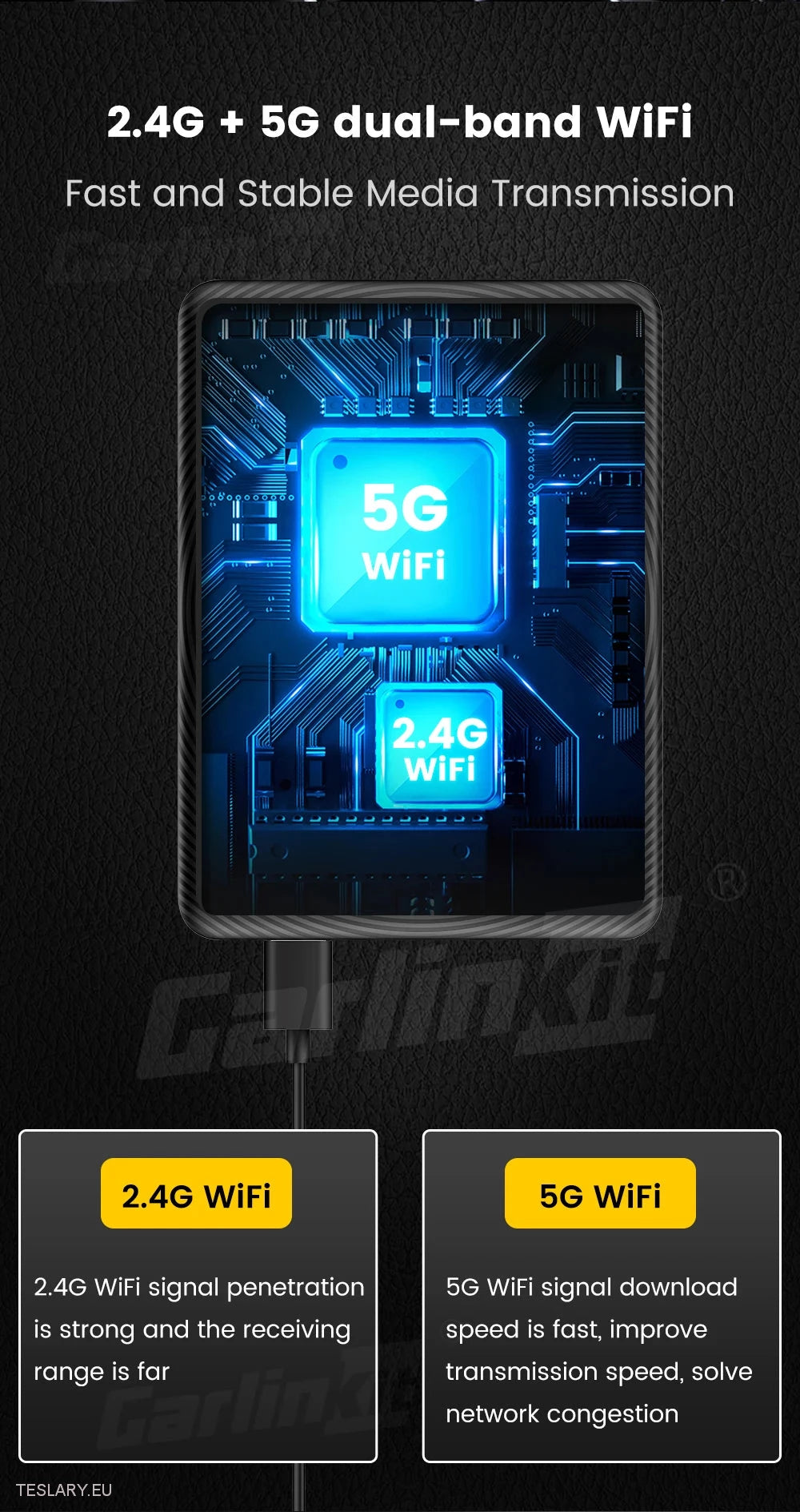 5,8 GHz overføringshastighet, rask dataoverføringshastighet og lav latens gjør det enkelt for brukere å koble til originale Tesla-modeller trådløst, noe som gjør det enda enklere å få tilgang til apper ved hjelp av bilens skjerm.