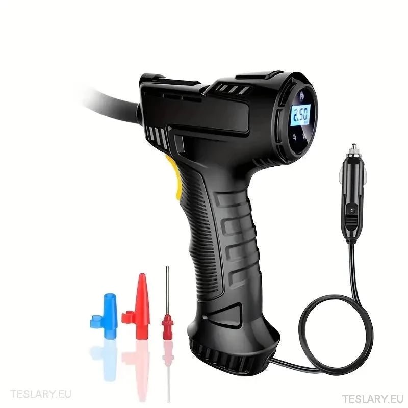 12-volts dekktrykkskompressorpistolen er designet for bekvemmelighet og presisjon, og kobles enkelt til bilens sigarettenneruttak i bakre midtkonsoll. Dette sikrer at du kan fylle opp dekkene når som helst, enten hjemme eller langs veien. Utstyrt med en innebygd lommelykt gir den klar sikt i svakt lys, noe som gjør dekkvedlikehold tryggere og enklere. Det digitale displayet lar deg stille inn ønsket PSI nøyaktig, og kompressoren stopper automatisk når måltrykket er nådd, noe som forhindrer overoppblåsing. Dette kompakte og brukervennlige verktøyet er viktig for å opprettholde optimal dekkytelse og sikkerhet.